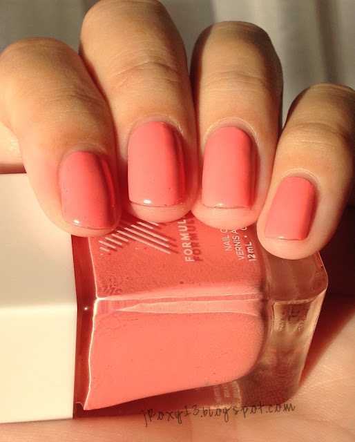 The polish included with this system was TGIF, a bright light coral creme. It's super bright but not neon - it's a color I would never have picked for myself, but I liked it on me. Application was pretty good. I did 2 medium coats because the formula had a tendency to drag and form ridges if I didn't float the brush.